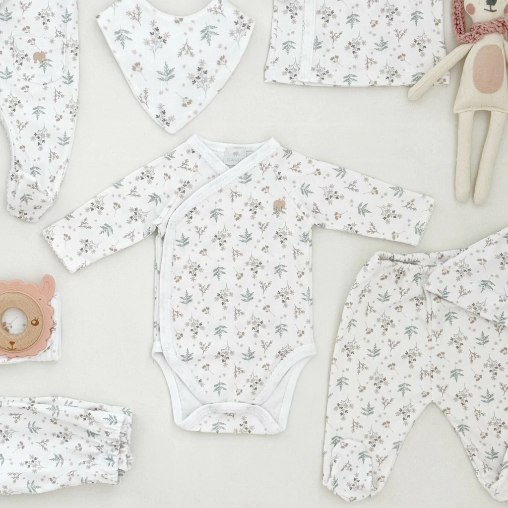 Descubre el conjunto Body cruzado, ranita y gorro Ramitos, una elección imprescindible para los recién nacidos. Este set está confeccionado en algodón pima, reconocido por su suavidad y calidad, ideal para la delicada piel de tu bebé.